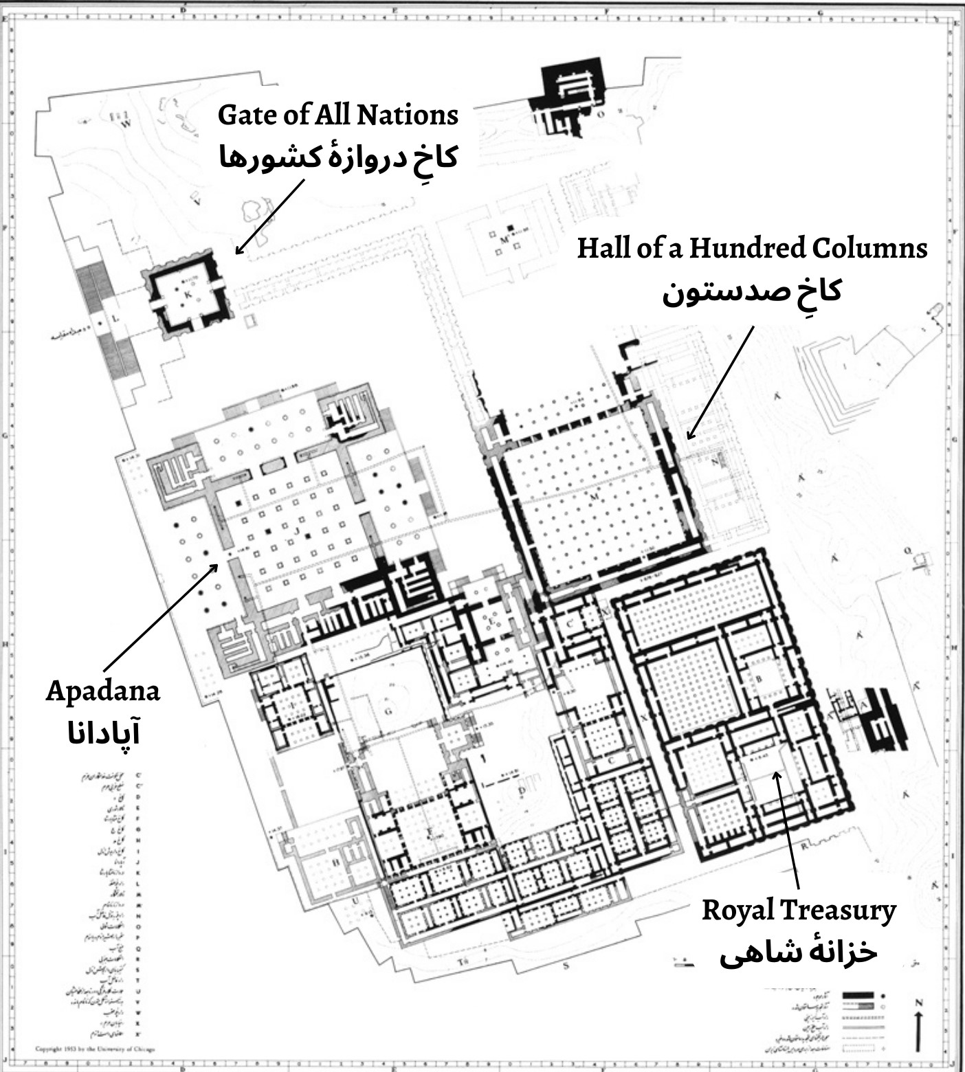 Our evidence for Achaemenid architecture comes from three main sites: 1) Pasargadae or پاسارگاد Pāsārgād, the new capital city built by Cyrus the Great after his victory over the the Medes; 2) Susa or شوش Shush, an important and ancient city of the Elamites and then later of the Achaemenids; and 3) Persepolis, پارسه Pārsa, or تختِ جمشید Takht-e Jamshid ‘Jamshid’s Throne’, the mighty ceremonial capital built by Darius the Great and completed during the reigns of his son and grandson (Xerxes I and Artaxerxes I). The remains of the ancient city of هگمتانه Hagmatāna (Hamedān) ‘Ecbatana’ and the necropolis of نقشِ رستم Naqsh-e Rostam ‘the Mural of Rostam’ are also archaeological sites worthy of mention from this time period.