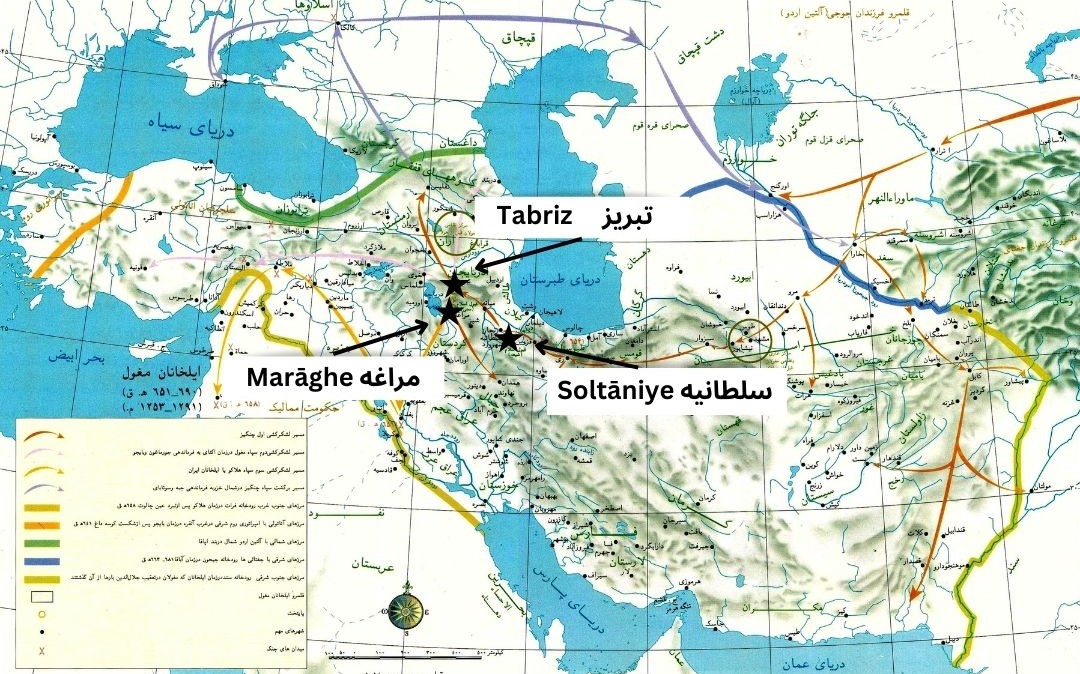 The Ilkhanids, being of Mongol origin and accustomed to inhabiting the dry steppe land of Central Asia, were still semi-nomadic. Due to this somewhat nomadic lifestyle, the only architectural remains we have from this period are immense large-scale building projects. This is because the Ilkhanids’ smaller or more day-to-day structures are thought to have been semi-permanent, so their remains have not survived to the present day. In this blog we will be looking at the three most famous immense building projects commissioned by the Ilkhanids: 1) the observatory of Marāghe, 2) the Arg of Tabriz, and 3) Öljaytü’s mausoleum at Soltāniye.