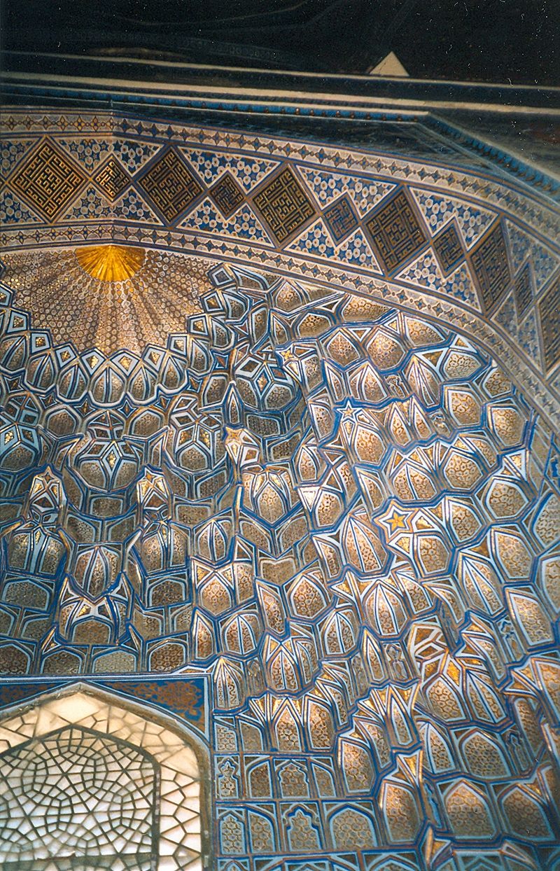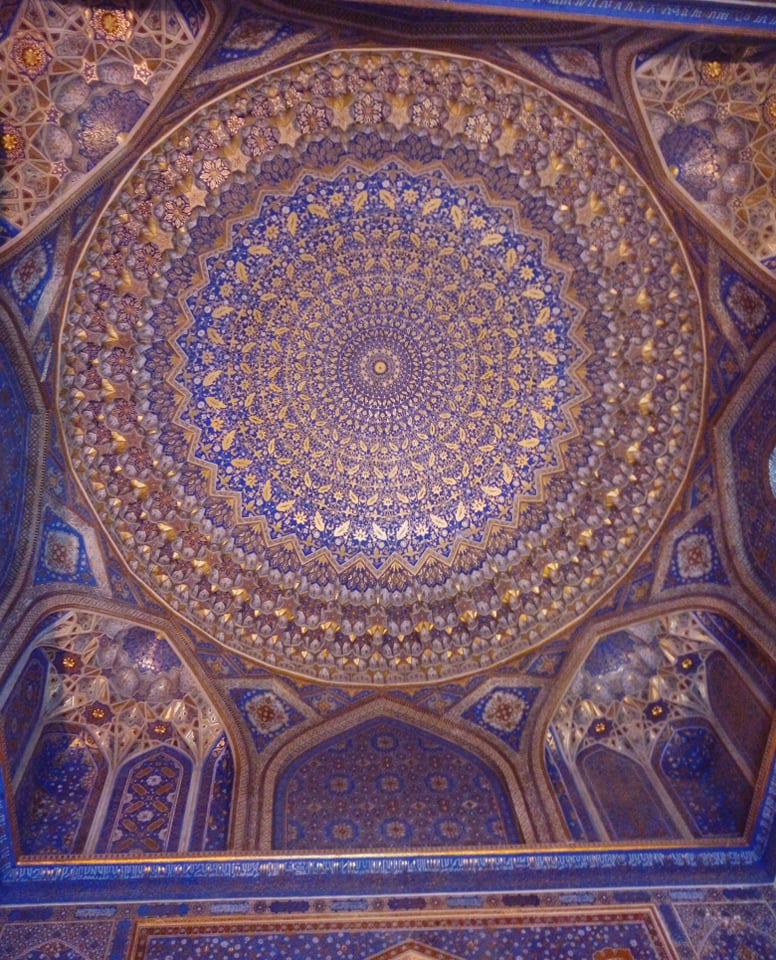 The Tillā-Kāri Madrese مدرسه طلاکاری was the last addition to the Registan. When you face the square, this is the building you see opposite you, with the two other madreses flanking it on either side. It is the largest building on the square, and for a while was used as the main congregational mosque of Samarqand. Tillā-kāri طلاکاری means ‘gold-gilded’, and to understand why it got this name you have to enter the main chamber and look up at the ceiling. The inside of the dome is covered with a beautiful blue and gold mosaic: