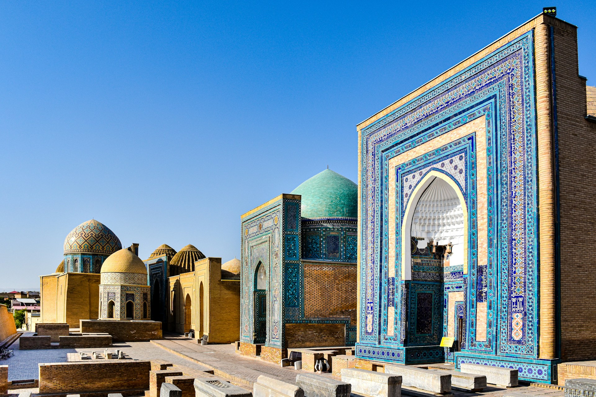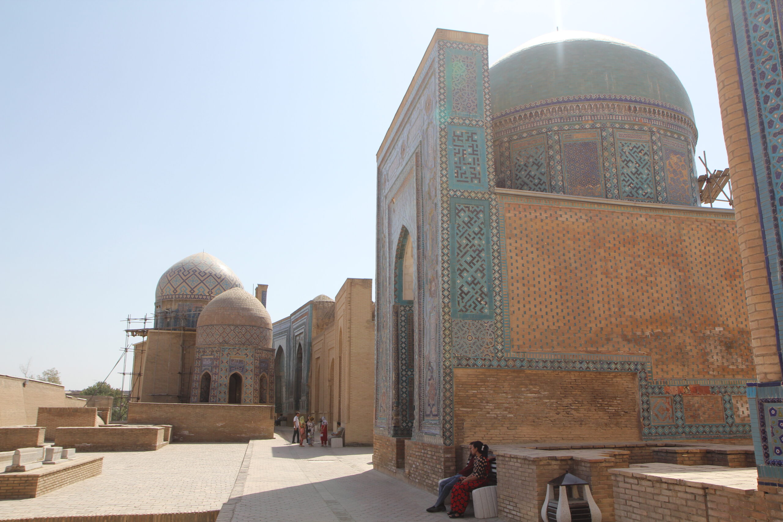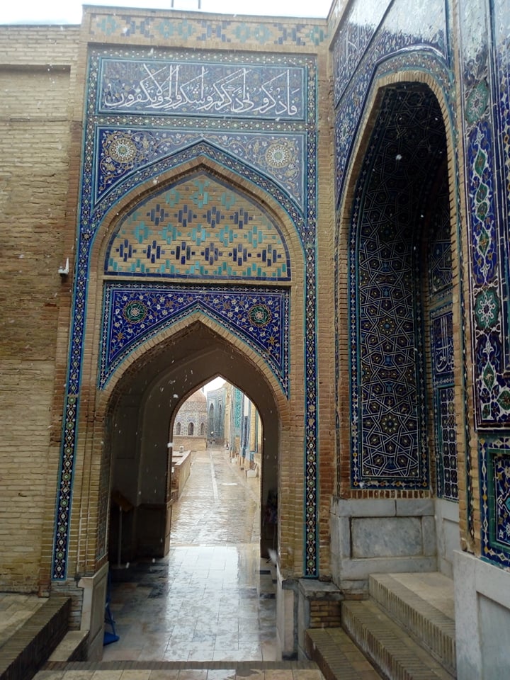 The Shāh-e Zende mausoleum complex (or Shohizinda in Uzbek and Tajiki Persian) is a necoropolis located on a hill on the edge of the old city of Samarqand. The necropolis complex centres around the mausoleum of قثم بن عباس Qosam Ebn-e Abbās, a cousin of prophet Muhammad who is credited with bringing Islam to Samarqand. According to local legend, during a siege of the city he narrowly escaped death and went into hiding underground, just outside the old city walls. That is how this mausoleum complex supposedly got its name: شاه زنده Shāh-e Zende ‘The Living King’, a.k.a the king who evaded death. This name has begun to take on a new, evocative meaning today, as now when you walk through the Shāh-e Zende complex, you really feel like these ancient kings and queens live on through the sheer beauty of their mausoleums.