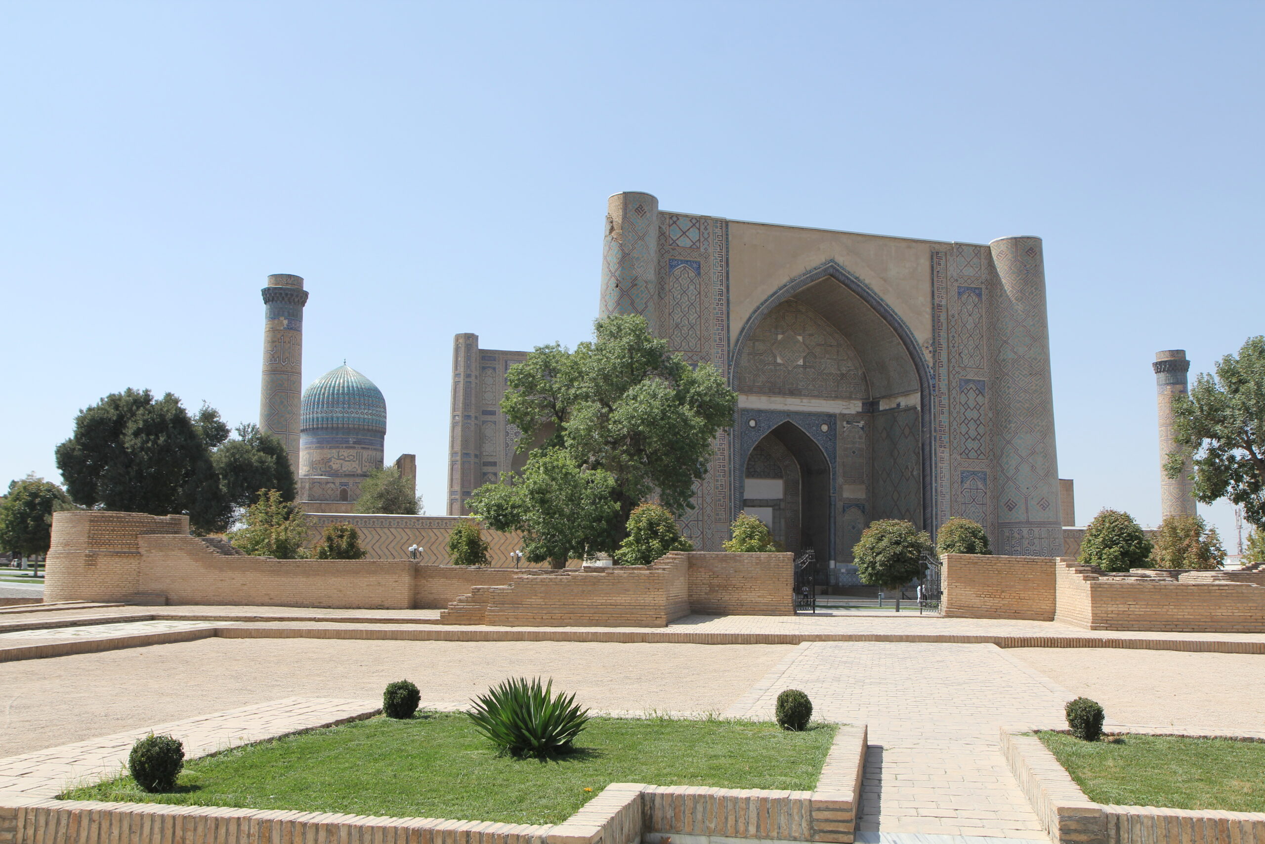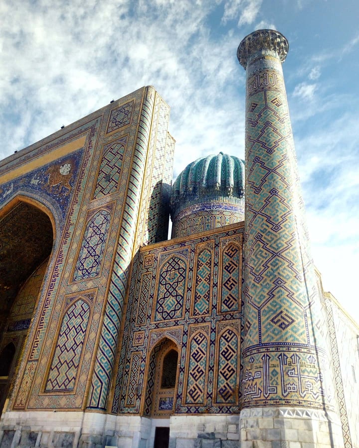 In this blog post we will be looking at some key monuments from the city of سمرقند Samarqand, a city located in Uzbekistan which is famous for its intricately mosaiqued mosques, mausoleums and madreses, as well as being a key stop on the ancient Silk Road route between Istanbul and China. Thanks to its central location approximately halfway along the Silk Road, for all of its history Samarqand has been known as a multicultural or ‘melting pot’ city. This remains true to this day, as the majority of the local population are trilingual: speaking Uzbek, Tajiki Persian, and Russian. The city has been inhabited for at least the last 2,500 years, making it one of the oldest cities in Central Asia. During Achaemenid times (553-329 BC), Samarqand was the capital of the Sogdian satrap [province]. In 329 BC, Alexander of Macedon conquered the city, which is known as Marákanda in Greek, and made it his base of operations in Central Asia.