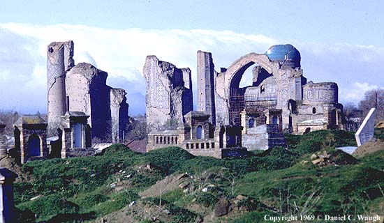 The Bibi Khānom Mosque (masjed-e bibi khānom in Persian, or bibixonim masjidi in Uzbek) was built between the years 1399 and 1404 AD to commemorate Timur’s wife, Sārāy Molk Khānom. This mosque remains one of the most ambitious building projects of its time. It could be said that Timur’s plans for this mosque were overly ambitious; the epic scale of the building, especially its large double domes and grandiose pishtāq, were plagued with problems during and after construction. The first pishtāq constructed for the mosque was allegedly torn down and ordered by Timur to be rebuilt on an even grander scale. Shortly following the completion of the mosque, bricks began to fall out of the large dome, and less than a century later the entire dome collapsed in on itself. For most of its history, the Bibi Khānom Mosque has been in a state of ruin or disrepair, especially following an earthquake in 1897.
