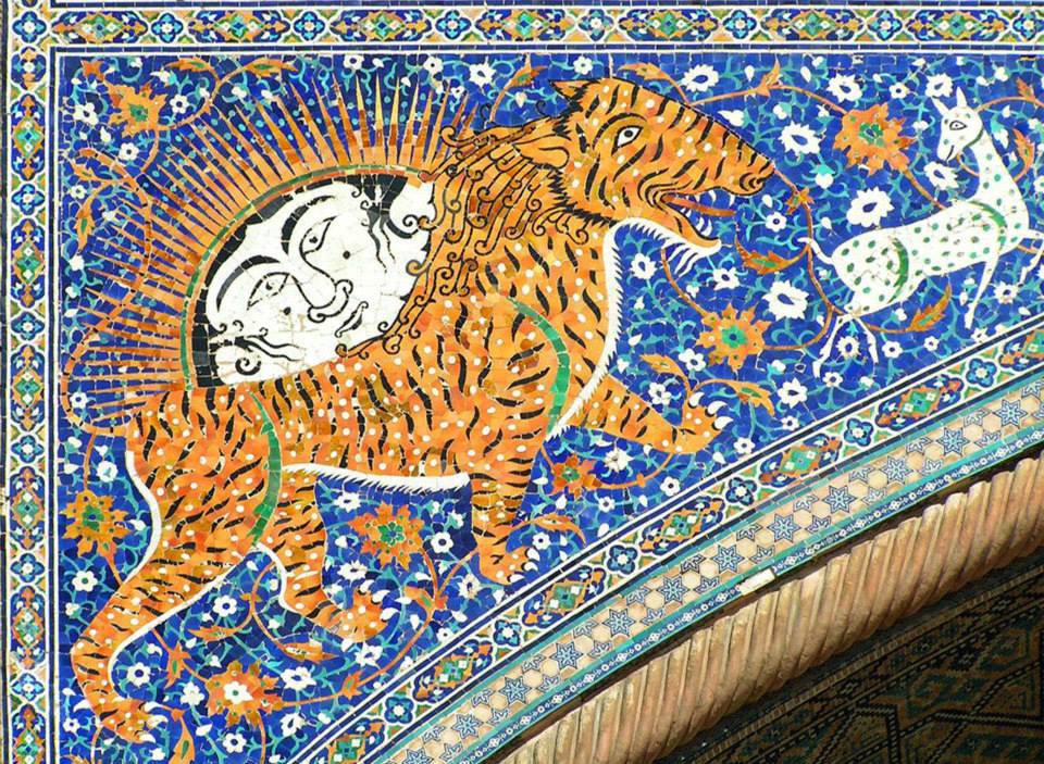 Opposite the Ulugh Beg Madrese we can find the Shir-Dār Madrese مدرسه شیردار (or the Sher-Dor Madrasasi in Uzbek). Although this madrese was built 200 years later, it was designed to mirror or mimic the Ulugh Beg Madrese opposite it. It is notable for the two lion-tiger motifs in the top corners of the pishtāq (collosal entranceway). These two lion-tiger figures each carry a sun with a human face on their backs. This is thought to be a heraldic symbol for the Timurid dynasty.
