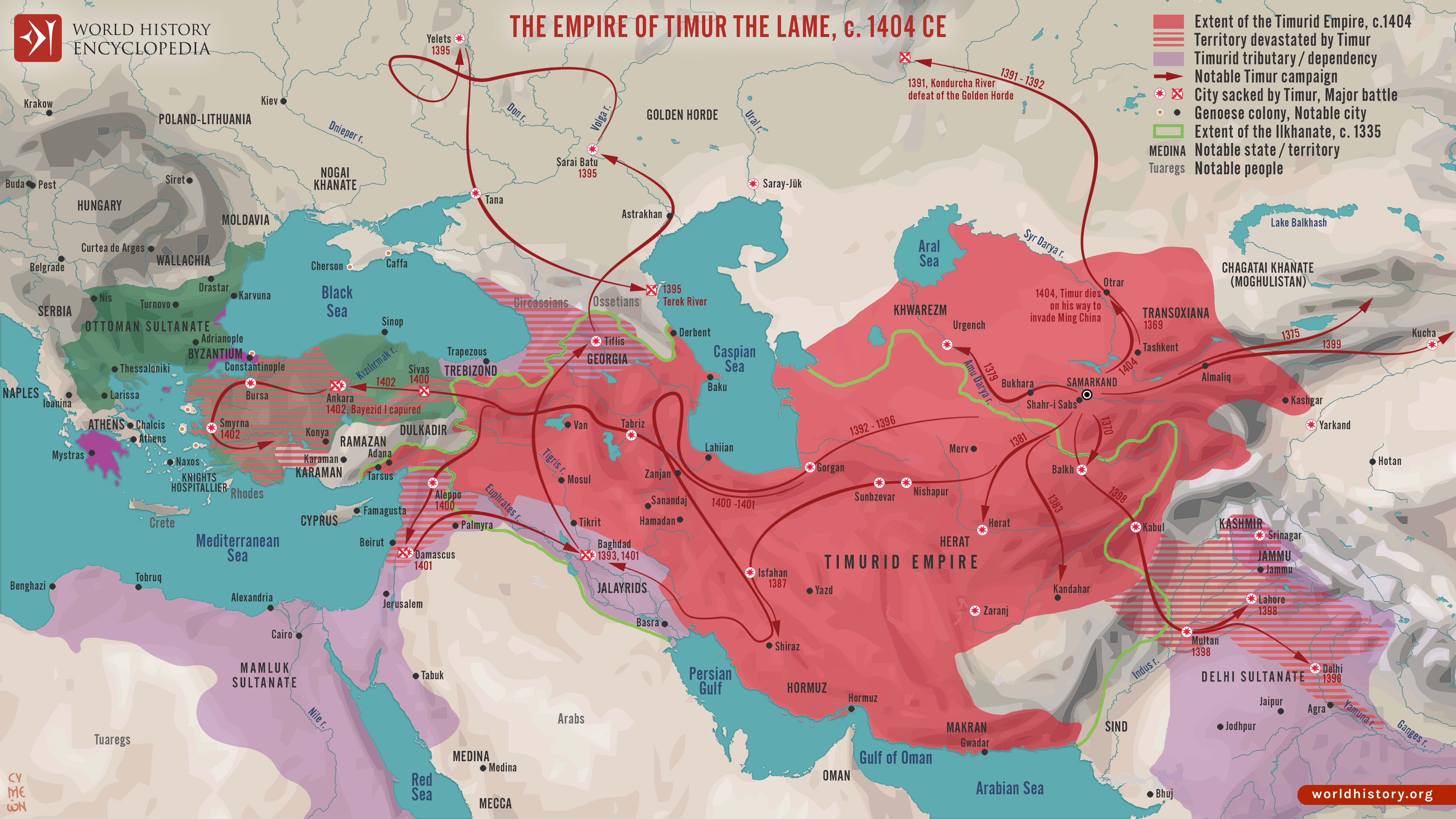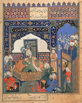 In English this empire is called Timurid, named after the first ruler of the dynasty: تیمور Timur or Tamerlane. The formal Persian name for the dynasty was ایران و توران Irān-o Turān, referring to the two historical regions encompassed by this empire – Turān being an old word used to refer to Central Asia, or more specifically ‘Transoxiania’ (the lands beyond the Oxus River). Another popular name for this dynasty was گورکان Gurkān, believed to be the Persianised form of the Mongol word Kuragan ‘son-in-law [of Genghis Khan]’. This title Gurkān was also in reference to the dynasty’s founder Timur, who claimed his sovereignty from the fact that he had married into Genghis Khan’s lineage.